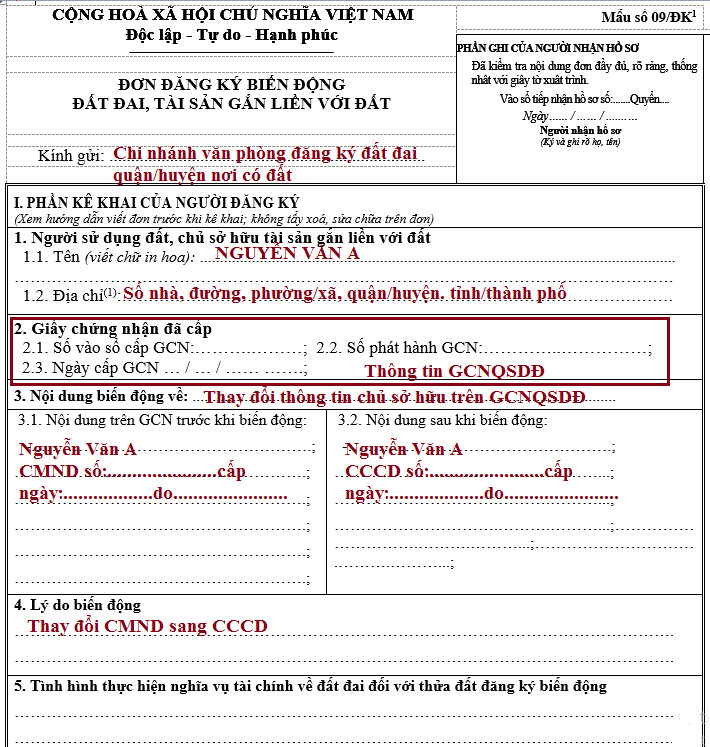 - Đơn đăng ký biến động đất đai, tài sản gắn liền với đất (theo Mẫu số 09/ĐK);